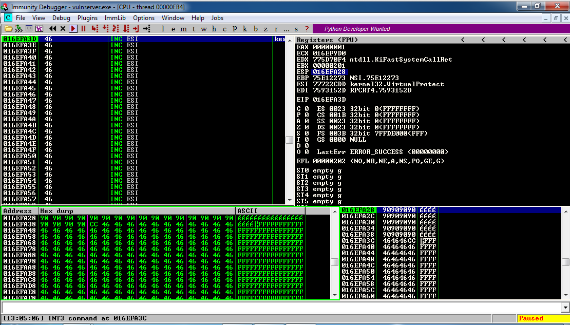 Just to test it, we'll put some NOP instructions there ('\x90' = No Operation -- they do nothing) followed by a '\xCC' INT 3 instruction, which will interrupt processing.