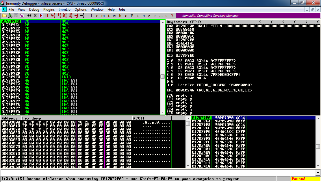 The lower left pane shows the NOP sled as a series of 90 bytes, followed by a CC byte.