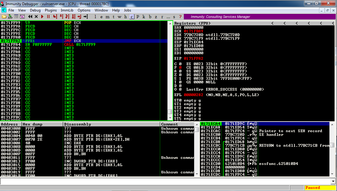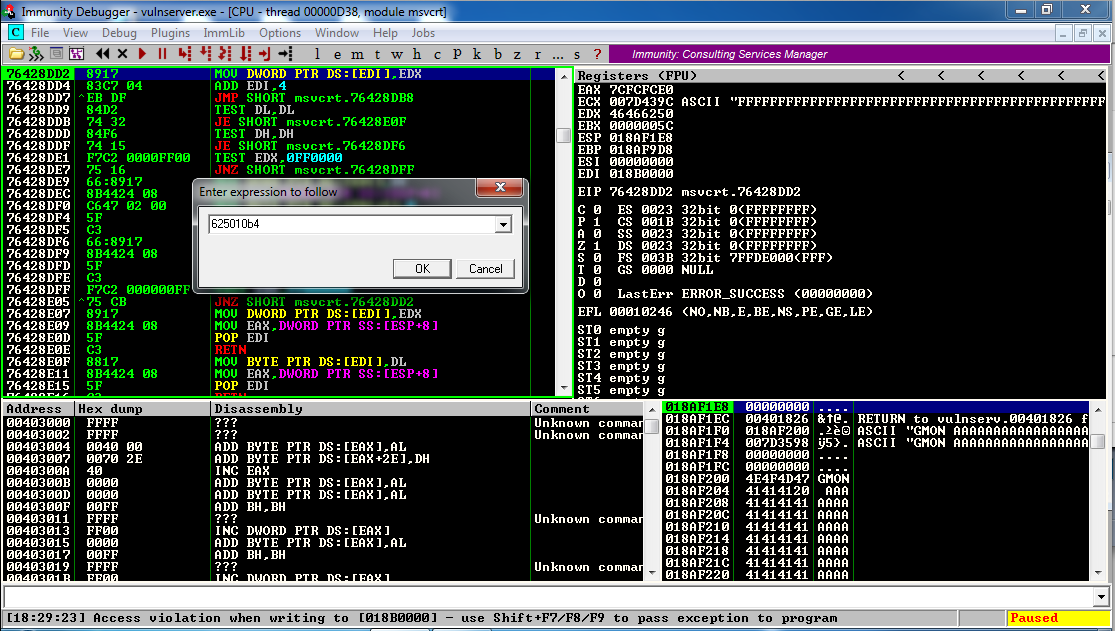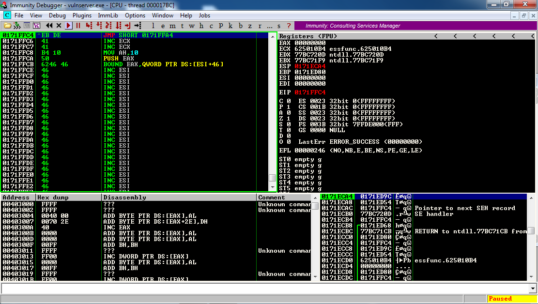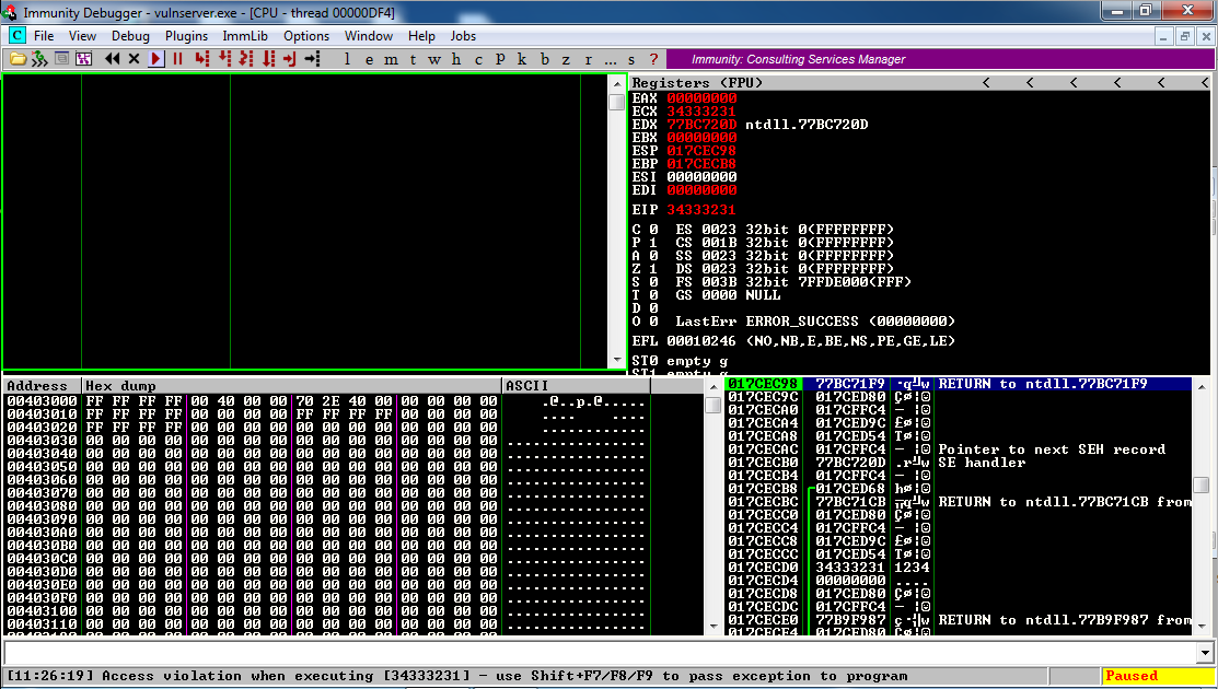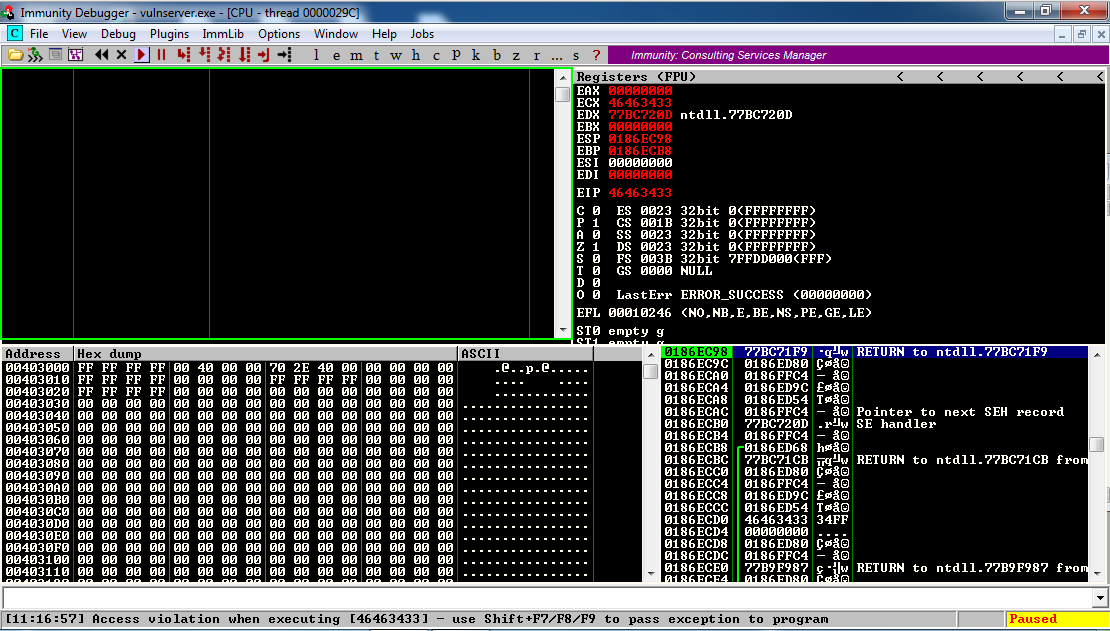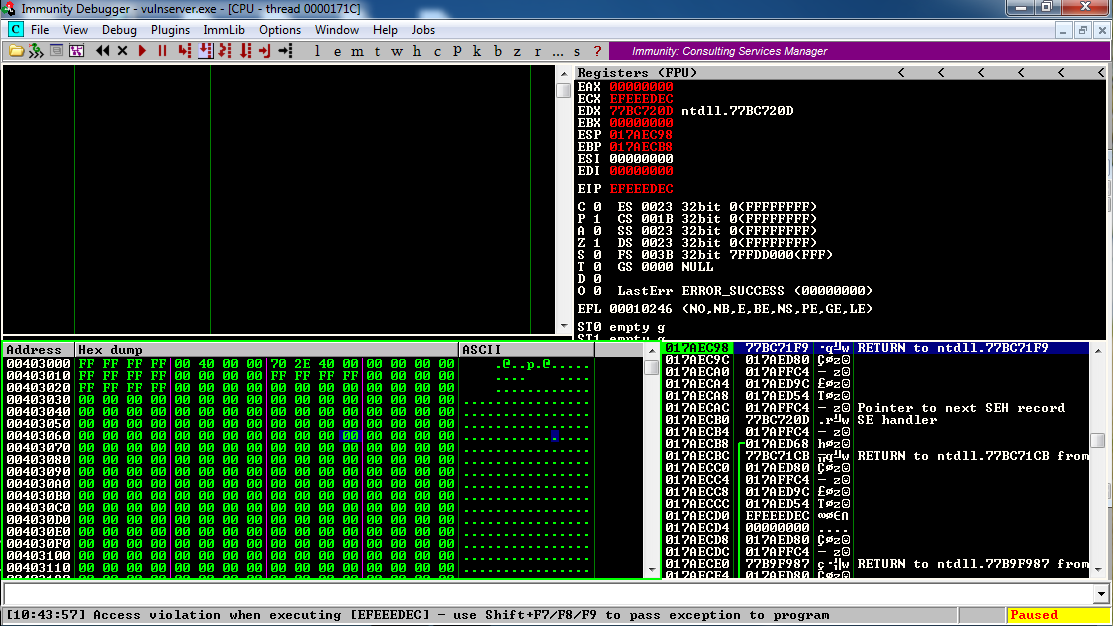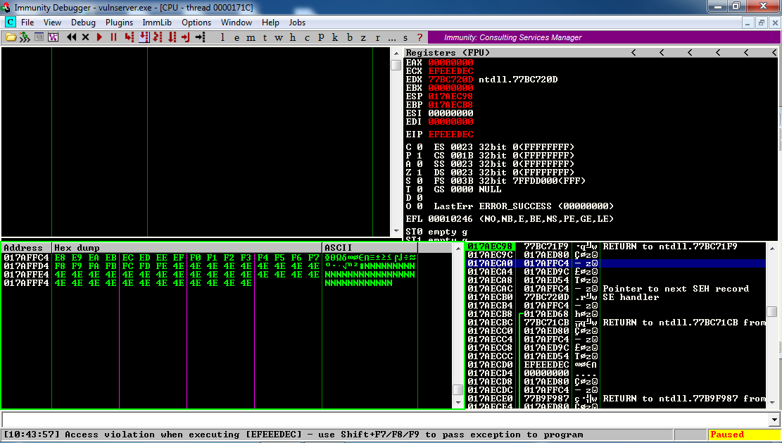 Now Immunity says "Access violation when executing [EFEEEDEC]", as shown below.