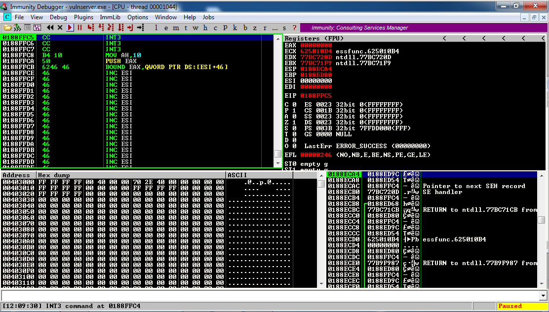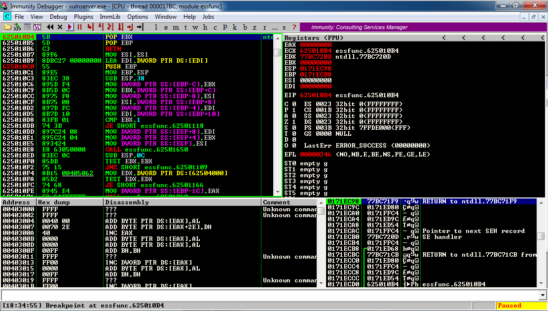 The code runs through the SE handler, and enters the POP POP RET code, where it stops with the message "Breakpoint at essfunc.625010B4", as shown below.
