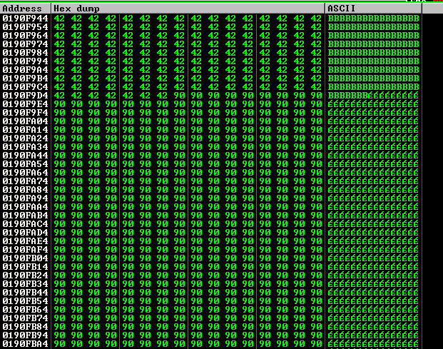 Let's also simplify the letters to use 'B' before the shellcode and EIP and 'F' after.