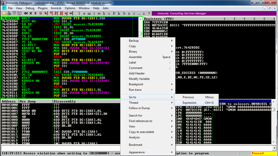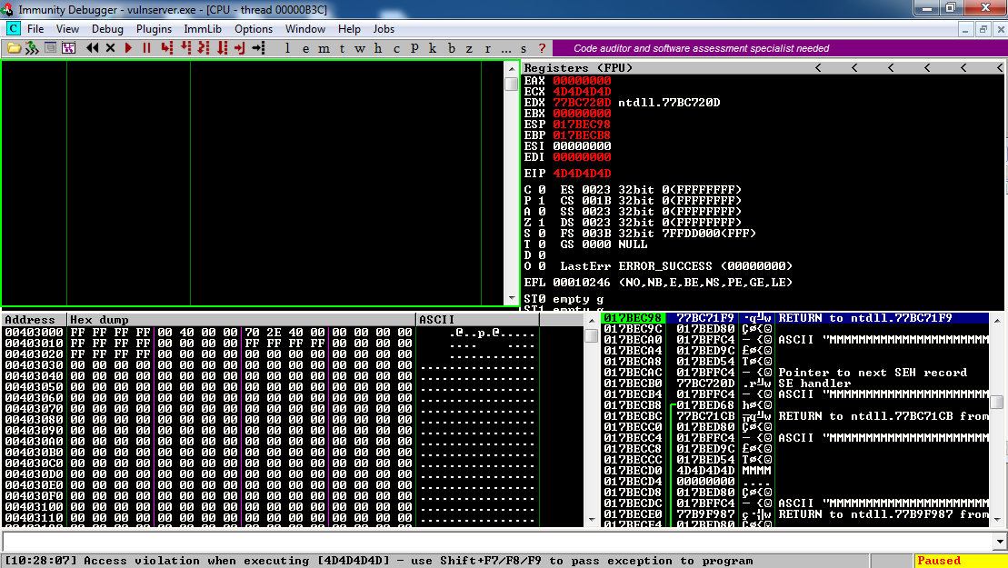 Press Shift+F9. Now Immunity says "Access violation when executing [4D4D4D4D]", as shown below.
