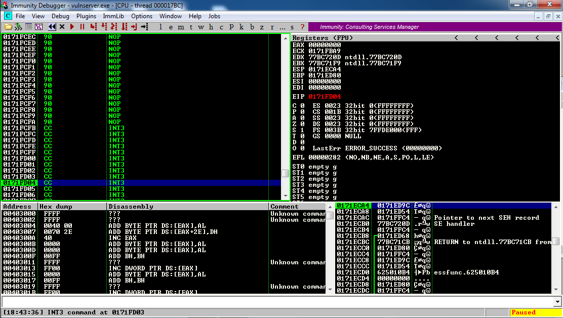 Now hold down F7 to step through the NOP sled and reach the INT 3 commands. It took 18 seconds when I did it, as shown below.