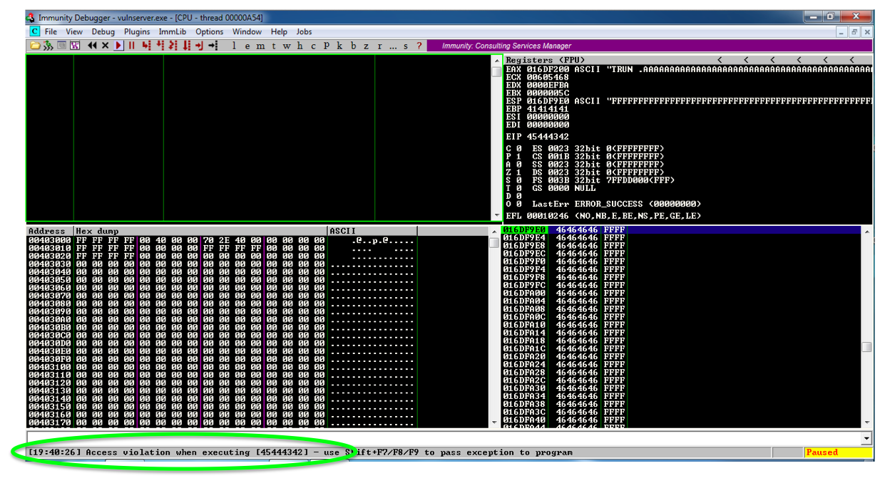 On your Windows 7 machine, in the Immunity window, at the lower left, you see "Access violation when executing [41414141], as shown below.