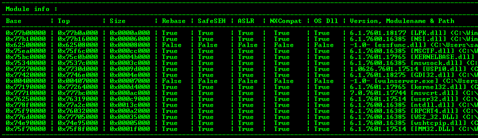 There are two modules with "False" in both the Rebase and ASLR columns: essfunc.dll and vulnserver.exe.