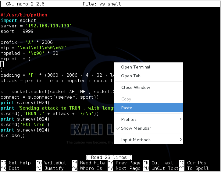Next you need to make the program executable. To do that, in Kali Linux, in a Terminal window, execute this command: