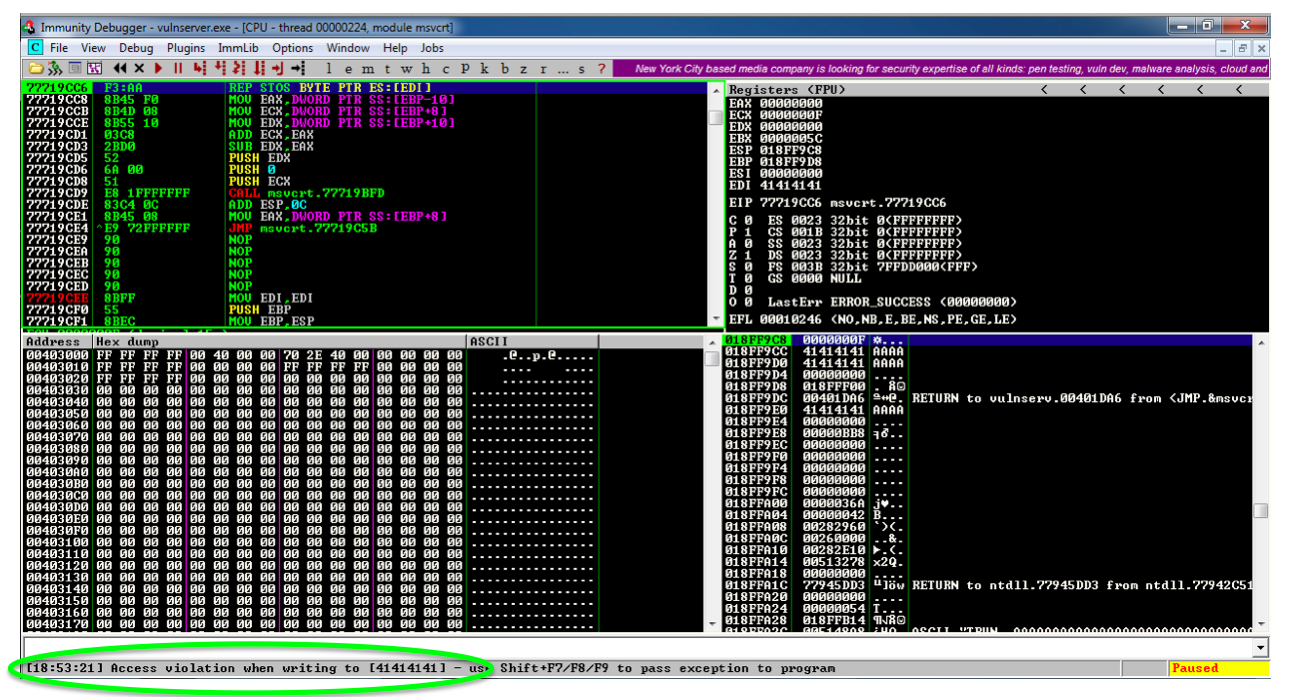 On your Windows 7 machine, in the Immunity window, at the lower left, you see "Access violation when writing to [41414141], as shown below.