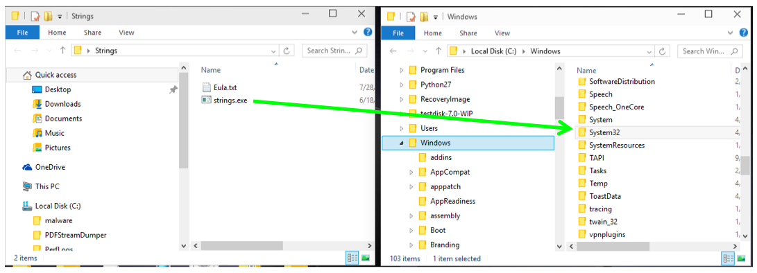 Drag the strings.exe file into the C:\Windows\System32 folder, as shown below.
