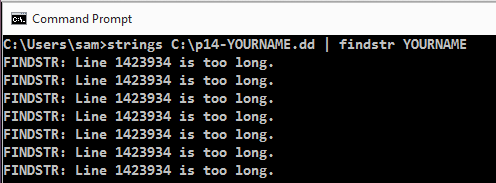 strings C:\p14-YOURNAME.dd | findstr YOURNAME