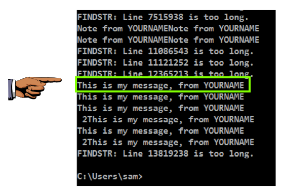 Eventually, findstr will pause its complaints long enough to show you the actual evidence lines containing YOURNAME, as shown below.