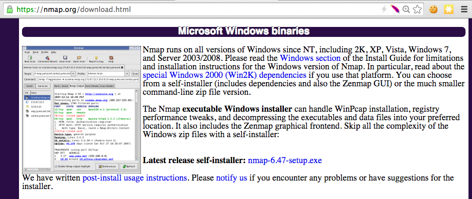 Scroll down to the "Microsoft Windows binaries" section, as shown below, and click on the link labelled "Latest release self-installer:", as shown below.
