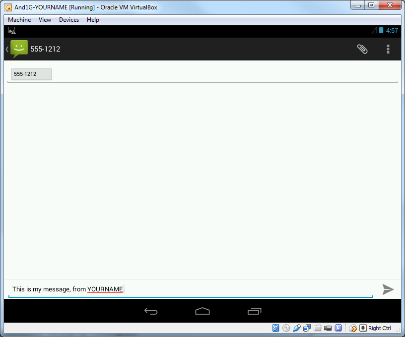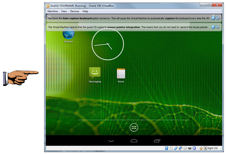 Click in the Android VM. Press Alt+F1. (On a Macbook, press fn+opt+F1. On the Macs in S214, press RightCtrl+Alt+Fn+F1).