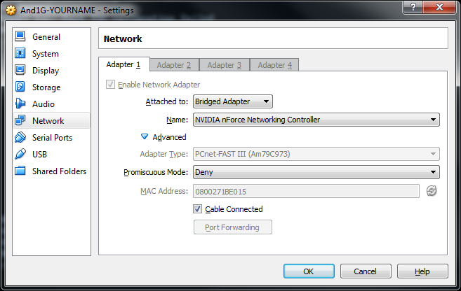 Change the "Attached to" setting to "Bridged Adapter", as shown below. Then click OK.