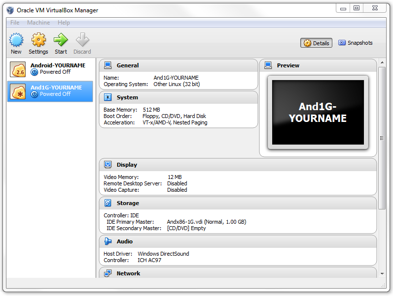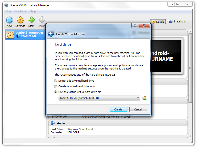 In the "Hard drive" box, click the "Uae an existing virtual hard drive" button. Click the little yellow folder icon on the right side, and navigate to the Andx86-1G.vdi in the folder you unzipped previously, as shown below.
