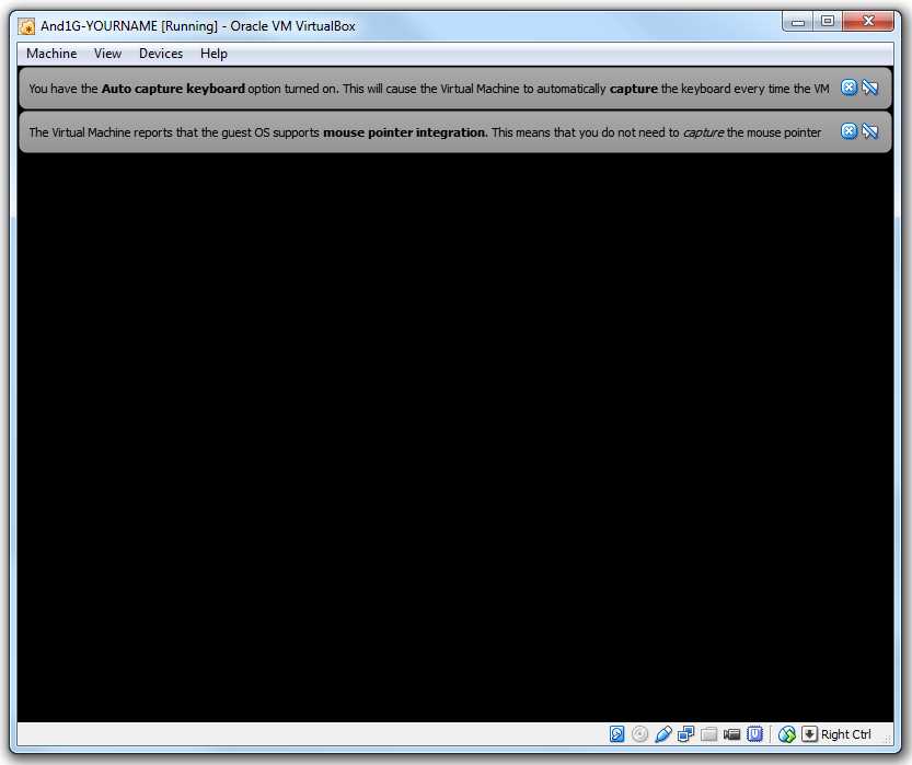 The virtual machine startsm but the screen turns black and shows two gray message bars at the top, as shown below.