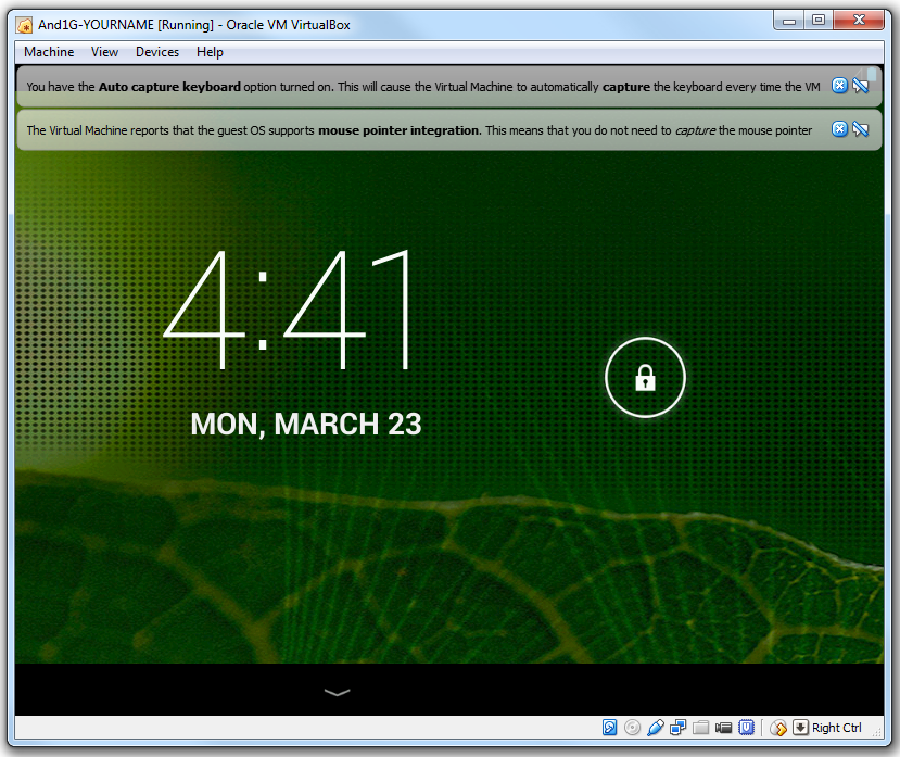 The mouse pointer appears inside the VM. Drag the padlock to the right to get to the Home Screen, as shown below.