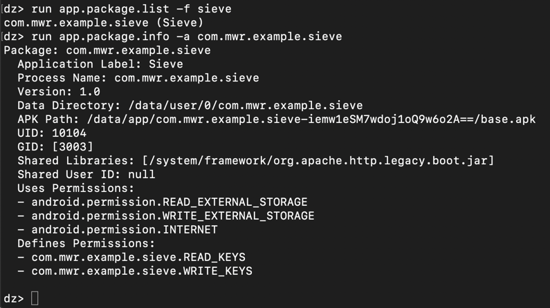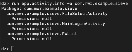 run app.activity.start --component com.mwr.example.sieve com.mwr.example.sieve.PWList