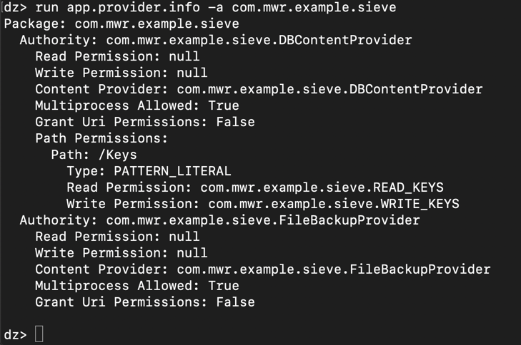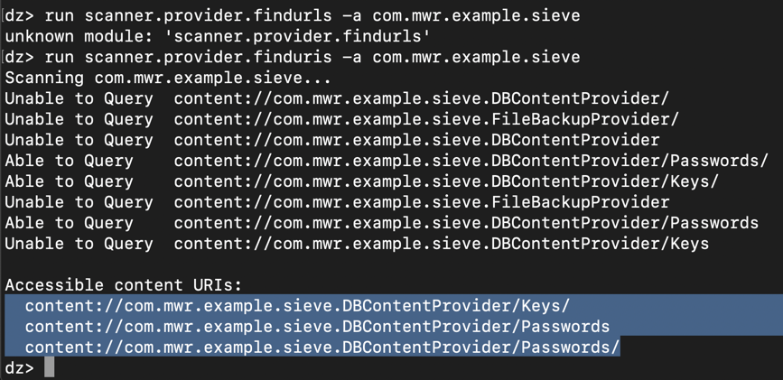 run scanner.provider.finduris -a com.mwr.example.sieve