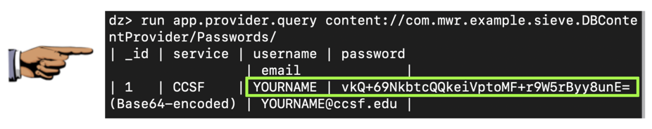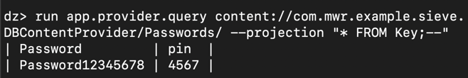 run app.provider.query content://com.mwr.example.sieve.DBContentProvider/Passwords/