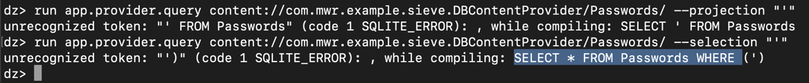 run app.provider.query content://com.mwr.example.sieve.DBContentProvider/Passwords/ --selection "'"