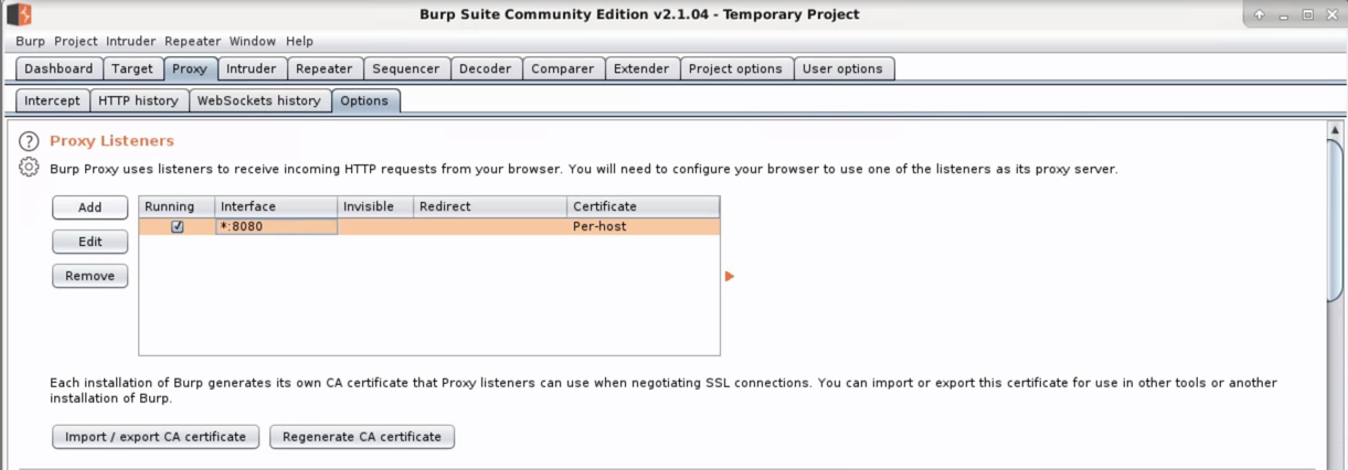 The "Proxy Listeners" section should now show an Interface of click *:8080, as shown below.