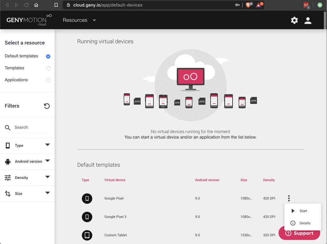 Log in. The Genymotion cloud main page appears, as shown below.