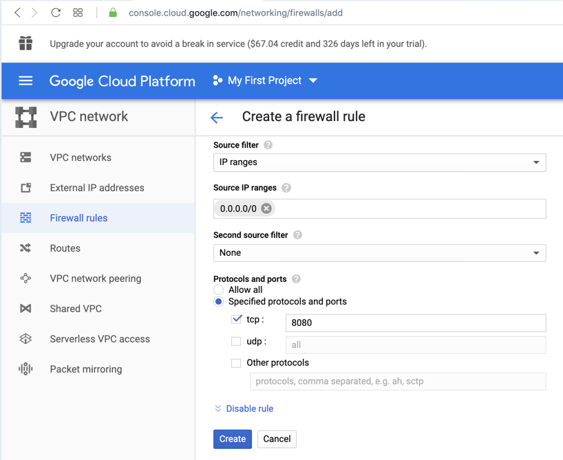 At the top center, click "CREATE FIREWALL RULE".
