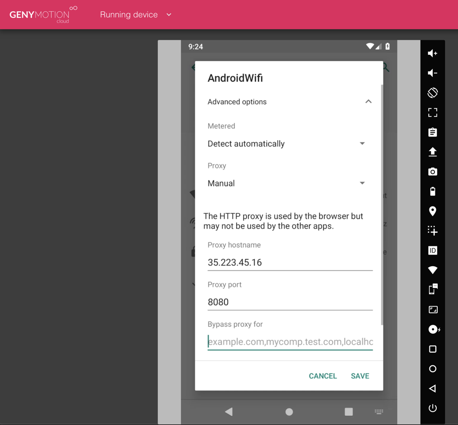 Set the Proxy to Manual. Enter your Debian Cloud Server's IP address and a port of 8080, as shown below.