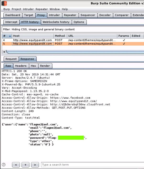 In Burp, click the second HTTP POST request and click the Response sub-tab to see the flag, which is covered by a green box in the image below.