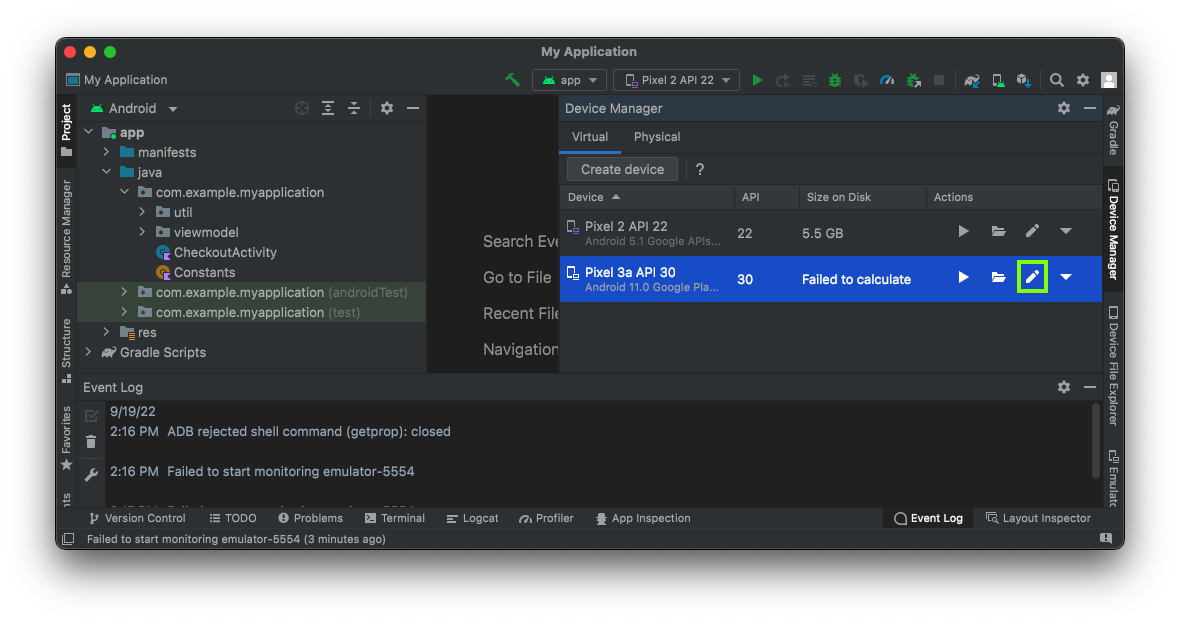 On the right side, in Device Manager, click the pencil icon to edit your emulated device, outlined in green in the image below.