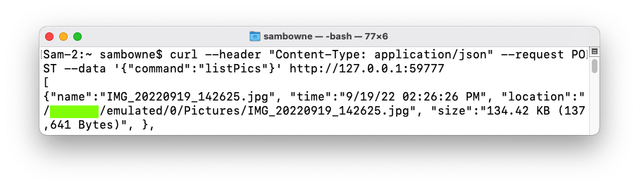 curl --header "Content-Type: application/json" --request POST --data '{"command":"listPics"}' http://127.0.0.1:59777