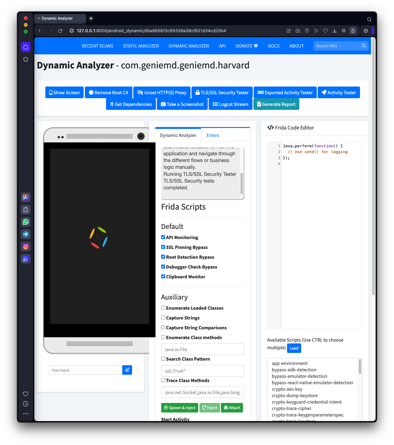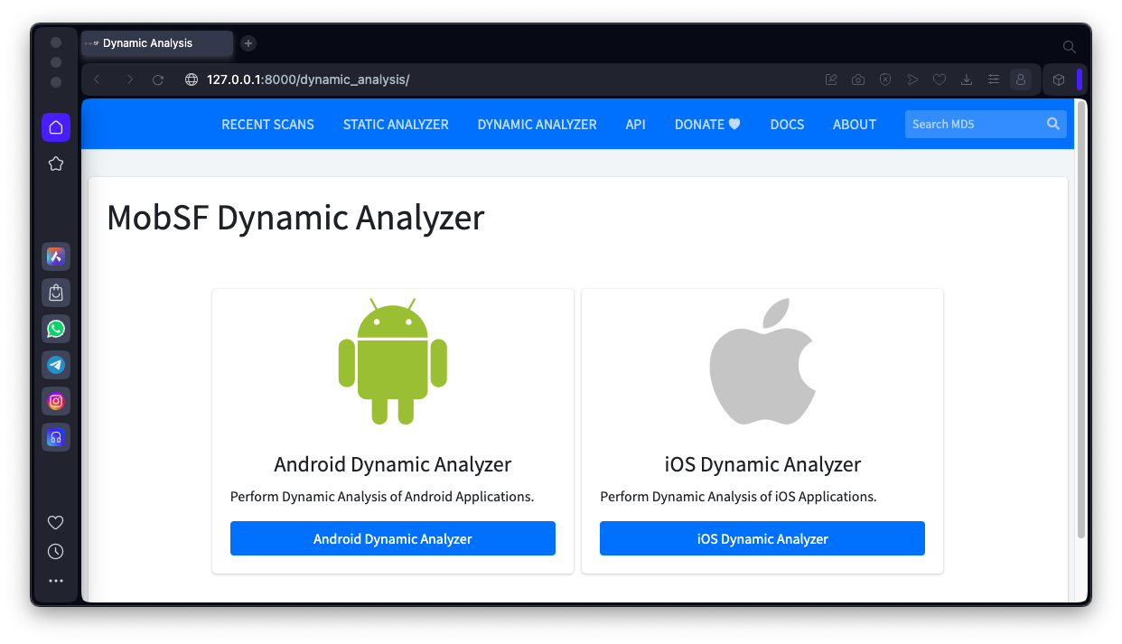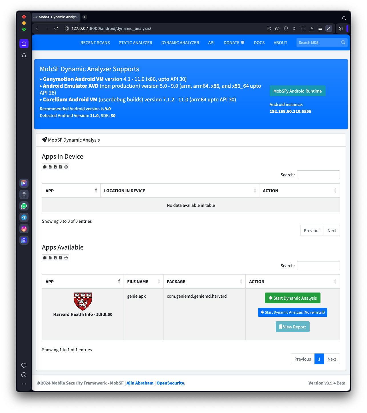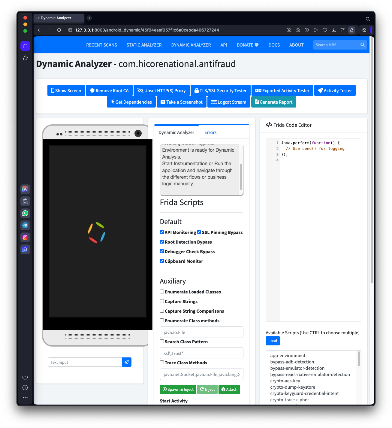 The MobSF Dynamic Analyzer page opens, as shown below.