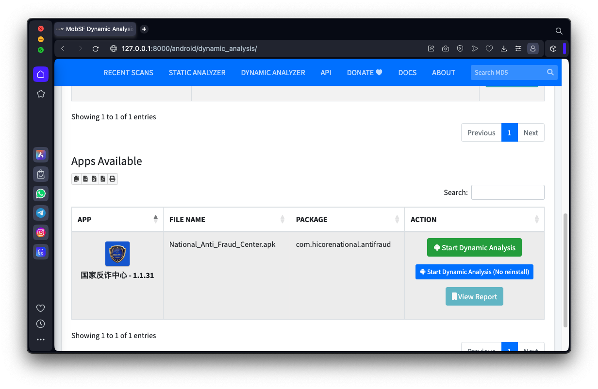 On the next page, at the bottom, find the "National_Anti_Fraud_Center.apk" line. On the right side, click the "Start Dynamic Analysis" button, as shown below.