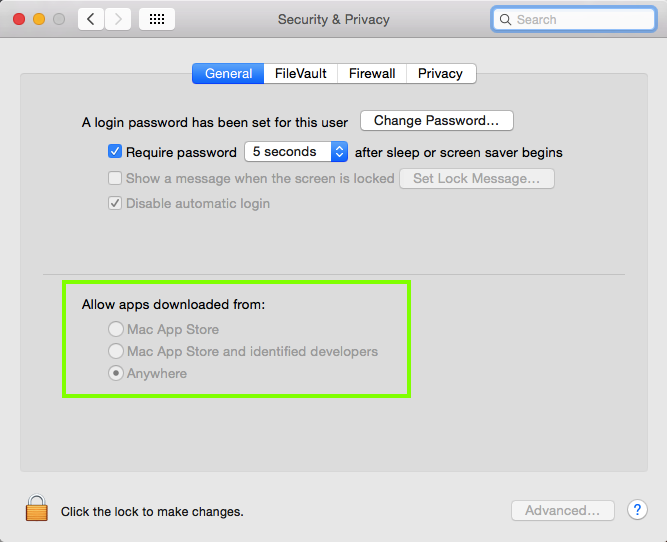 If error messages appear, saying you cannot run software from unknown sources, open "System Preferences", click "Security & Privacy", and configure your Mac to Allow apps downloaded from Anywhere, as shown below.