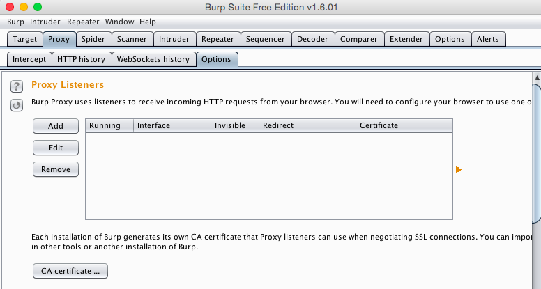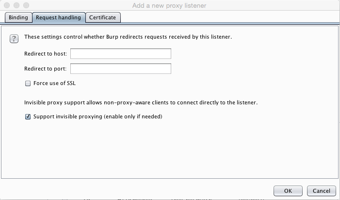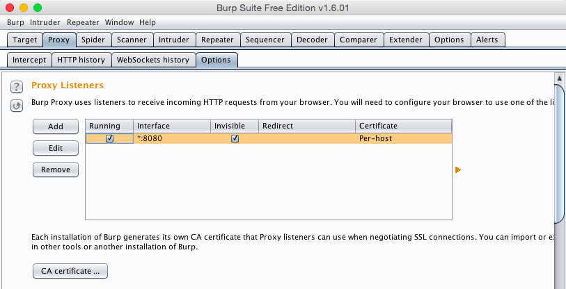 Burp should now show a Listener on "*:8080" with the Invisible box checked, and the Running box checked, as shown below.