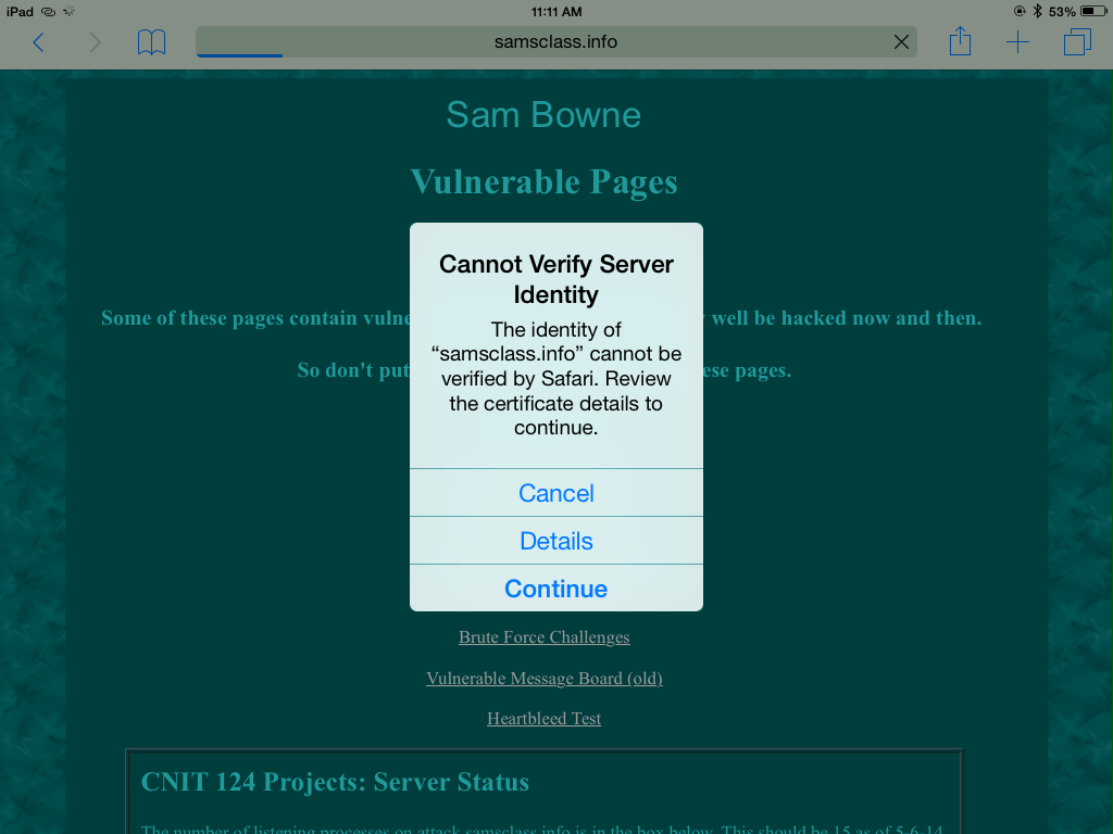 You should see a "Cannot Verify Server Identity" message, as shown below.