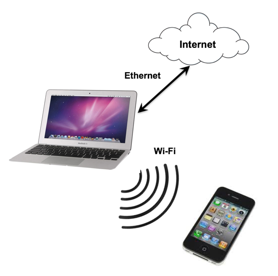Note: I was also able to share my Wi-Fi connection via BlueTooth on my latest Mac, and that might work for you too. However, Internet sharing is very buggy, and often only one type of sharing will work on each Mac, in an unpredictable manner.