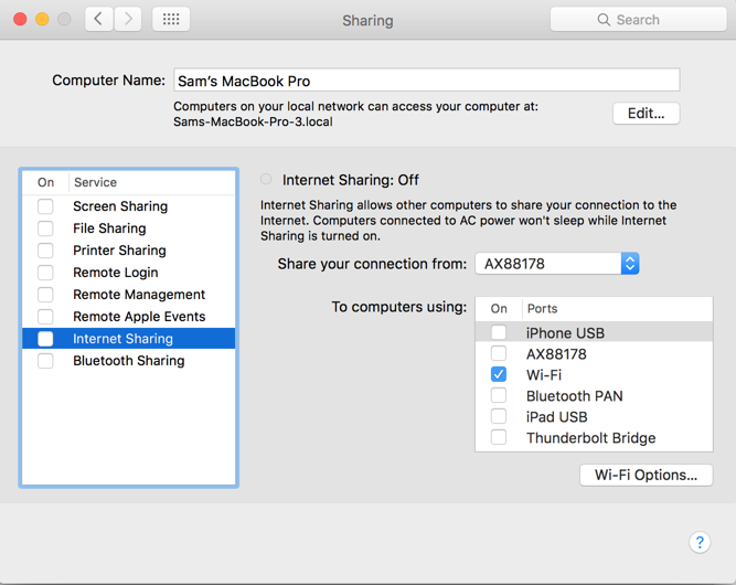 In the "To computer using" list, check Wi-Fi, as shown below.