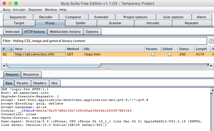 Burp is now intercepting and examining your mobile device's Internet traffic. There's no way for your mobile device to detect this man-in-the-middle attack for the HTTP protocol, which is one of the reasons it's an insecure protocol. However, Burp won't be able to get away with that with a properly-implemented HTTPS protocol.