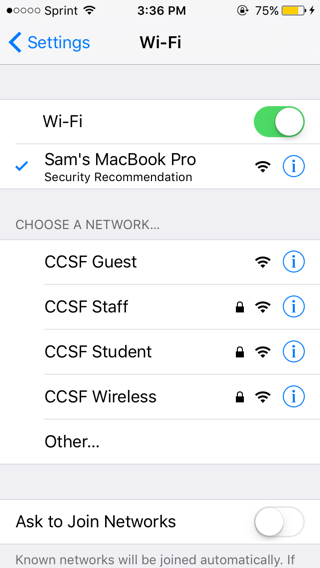 On the mobile device, turn on Wi-Fi and connect to the network from your Mac. It should have an obvious name, such as "Sam's Macbook Pro", as shown below.