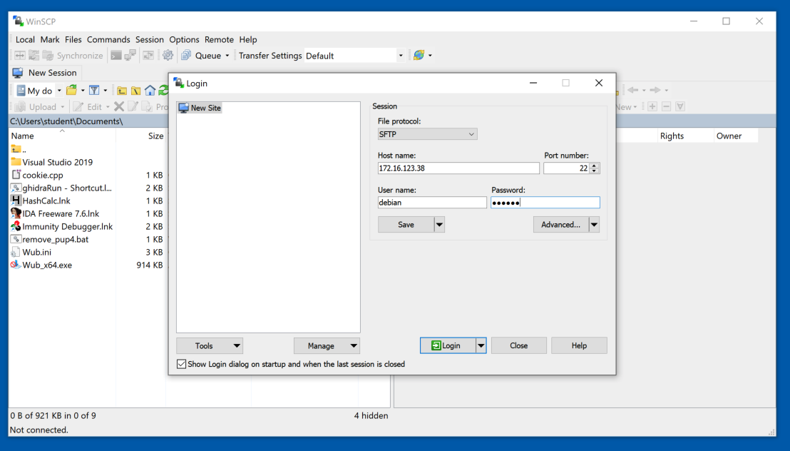 When WinSCP launches, fill in the IP address, username, and password of your Linux server, as shown below.